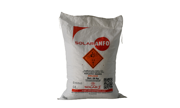 SOLARANFO, ağırlıkça % 94,5 oranında Pril-Poroz Amonyum Nitrat ile %5,5 oranında motorinin oksijen dengesi gözetilerek homojen olarak karıştırılması ile hazırlanan serbest akışkan özelliğe sahip toz patlayıcıdır. Açık ocak çalışmalarında (Dekapaj, Taşocağı, Baraj, Karayolu) kullanılır. SOLARANFO, Kapsüle duyarlı patlayıcı değildir. Patlatılması için kapsüle duyarlı bir patlayıcı ile yemlenmesi gerekir. Kapsüle duyarlı SUPERPOWER emülsiyon patlayıcı bu işlem için çok uygundur. SOLARANFO, suya dayanıklı patlayıcı madde değildir, sulu deliklerde tek başına kullanılması önerilmez. Özellikle kuru deliklerde kullanılmakla birlikte az sulu ya da sulu deliklerde de su seviyesi geçildikten sonra emülsiyon patlayıcılar ile birlikte kullanılabilir. Orta ve büyük çaplı patlatma deliklerinde kullanılır. Dip ve kolon boyunca ana patlayıcı olarak kullanılır. Akıcı olması nedeni ile dik delik uygulama larında çok rahat delik şarjı olanağı tanır. Sulu ortamlardan, zorlu hava koşullarından, radyo dalgaları ve statik elektrikten etkilenmez, bu sayede daha güvenli bir kullanım sağlar.